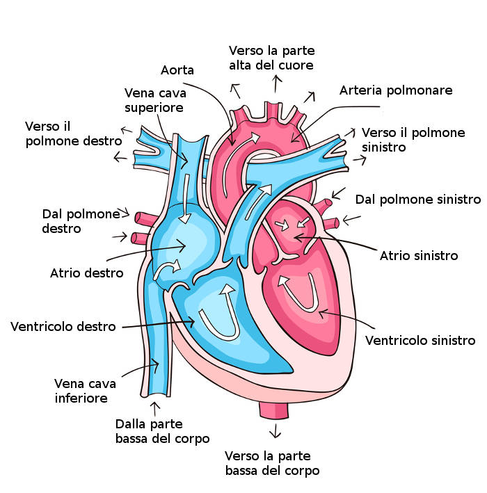 la camera inferiore sinistra del cuore (ventricolo sinistro) diventa più grande e perde la capacità di contrarsi abbastanza da forte da pompare la necessaria quantità di sangue ricco di ossigeno al resto del corpo (tratto blu che sale verso l’alto nell’immagine). - Insufficienza cardiaca con funzione ventricolare sinistra conservata: il cuore si contrae e pompa normalmente, ma i ventricoli (le camere inferiori) sono più spesse e rigide del normale, perdendo la capacità di rilassarsi e quindi riempirsi completamente. La presenza di una ridotta quantità di sangue nei ventricoli si traduce in una minor quantità espulsa all’atto della contrazione.