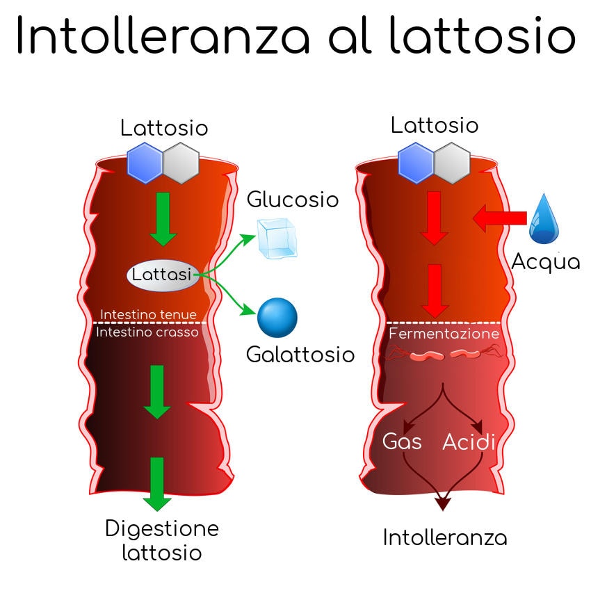 Quando l’enzima lattasi non è più debitamente espresso, il lattosio passa indigerito attraverso l’intestino tenue, dove richiama acqua che sarà poi responsabile della comparsa di diarrea.
