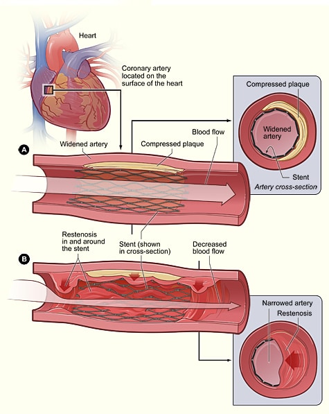 Un altro problema che si può verificare dopo l’angioplastica è la crescita eccessiva del tessuto in corrispondenza dello stent: l’arteria si può restringere o chiudere una seconda volta (restenosi).